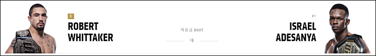 현 미들급 챔피언인 로버트 휘태커는 24승 4패로 앤더슨 실바 이후 최고의 미들급 강자였으나 마지막 경기인 요엘 로메로와의 2차전에서 간신히 판정승을 거둔 이후 탈장 등 부상으로 약 1년 4개월 만에 경기를 치르게 됩니다.