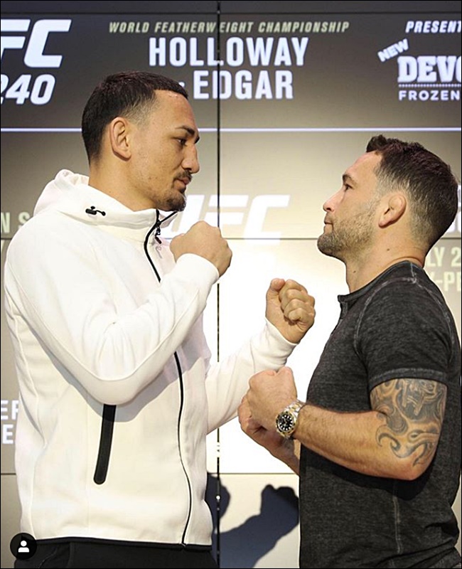 이번 UFC 240 메인카드 중 메인 이벤트는 현 페더급 챔피언 맥스 할로웨이와 도전자 프랭키에드가의 페더급 타이틀 전입니다. 메인카드 중계는 오전 11시부터 예정되어 있습니다.