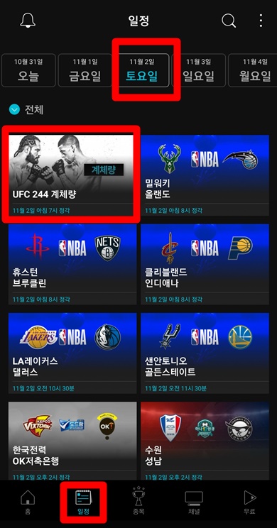 - 하단 메뉴바에서 '종목'을 클릭하고 '종합격투기'를 선택하면 관련 영상만 나오게 됩니다. 메뉴바의 '일정' 메뉴는 UFC 뿐만아니라, 스포티비 나우에서 중계하는 국내외 스포츠 전 일정을 볼 수 있습니다.